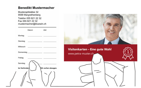 Die geleimte Oberfläche verleiht dem Offsetpapier «280g/m2 Standard-Karton» eine leicht raue Struktur. Dadurch lässt sich dieses Papier ideal im Laser- oder Inkjet-Drucker bedrucken. Ebenso lassen sich auf «280g/m2 Standard-Karton» gedruckte Visitenkarten gut mit Kugelschreiber, Füller, Filzstift etc. beschreiben oder auch stempeln. Je höher die Grammatur (g/m2), desto stabiler sind die Visitenkarten.